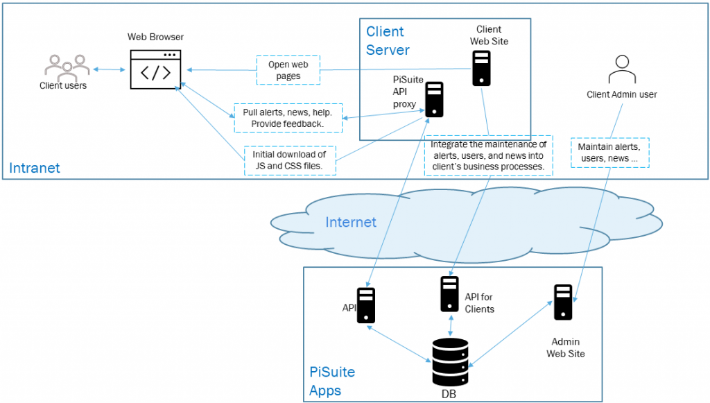 In the following deployment scenario, all the resources and APIs required by the client web application are deployed to the client server. The web browser gets all PiSuite-related resources from the PiSuite API proxy. PiSuite API proxy serves the static files such as JS and CSS files. Browser calls related to retrieving alerts, news, help, and providing feedback are redirected to PiSuite API, and the data is then served to the browser.